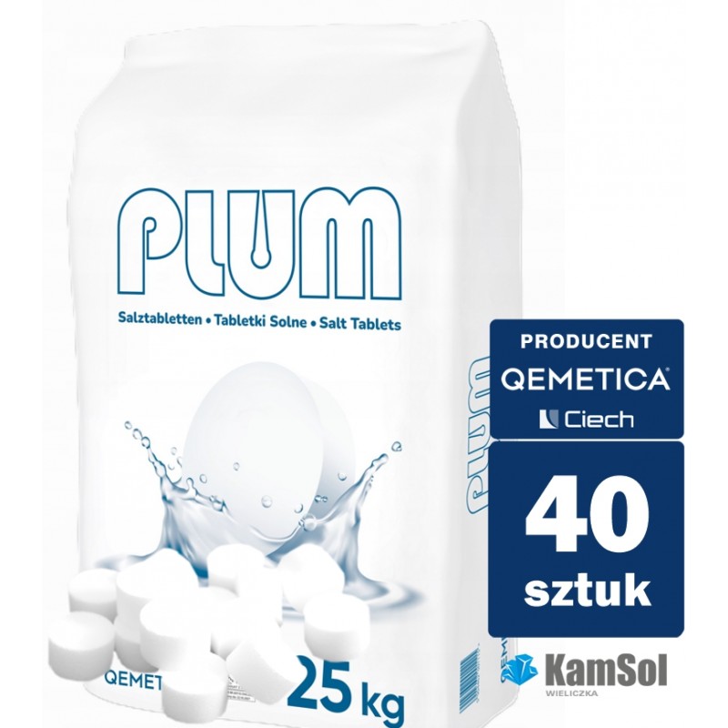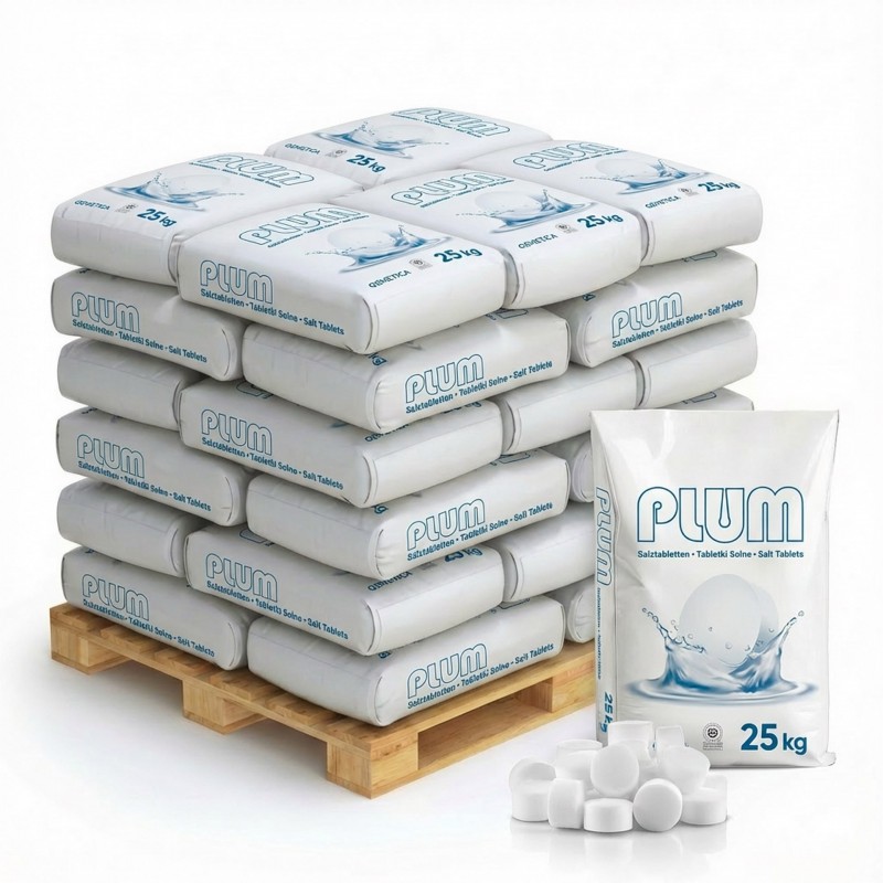 Tabletki solne PLUM QEMETICA (dawny CIECH) – 1000 kg (40 worków × 25 kg) – zestaw promocyjny do zmiękczaczy i stacji uzdatniania wody. ? W zestawie otrzymujesz 40 worków po 25 kg soli tabletkowanej PLUM (tabletki solne / pastylki solne) od producenta Soda Polska QEMETICA (dawny CIECH S.A.). ✅ Oryginalne opakowania producenta (z logiem Soda Polska QEMETICA – dawny CIECH) potwierdzają pochodzenie soli ze sprawdzonego źródła i wspierają prawidłową pracę urządzeń. ▶ Skład i jakość ? Tabletki produkowane są z wyselekcjonowanej soli warzonej (chlorek sodu – NaCl) i nie posiadają w swoim składzie zanieczyszczeń mechanicznych. Tabletka solna nie posiada zapachu, a jej użycie wspiera uzyskanie bardzo dobrych parametrów wody. Woda po zastosowaniu soli tabletkowej jest bezpieczna i gotowa do użycia w codziennych instalacjach. ▶ Do czego służy sól tabletkowana PLUM? Tabletki solne są stosowane do regeneracji wymieniaczy jonitowych (stacje uzdatniania / stacje zmiękczania wody) jako środek regenerujący żywicę jonowymienną. Dzięki równomiernemu rozpuszczaniu wspierają stabilną pracę zmiękczacza oraz ograniczają problemy eksploatacyjne. ▶ Zastosowanie tabletek solnych PLUM QEMETICA (dawny CIECH) • procesów zmiękczania wody • procesów uzdatniania wody • określonych zmywarek domowych i przemysłowych • myjni samochodowych • innych procesów wymagających tabletek solnych do prawidłowej pracy ▶ Najważniejsze korzyści ✔ zgodność z najbardziej restrykcyjnymi wymaganiami producentów stacji uzdatniania wody ✔ brak zanieczyszczeń mechanicznych mogących narazić zmiękczacz na uszkodzenia ✔ ograniczenie powstawania złogów solnych, które obniżają skuteczność urządzeń ✔ stała, powtarzalna jakość – proces produkcji podlega monitoringowi i kontroli ✔ atest producenta – skład zgodny z parametrami na opakowaniu ✔ atest PZH ▶ Parametry tabletki ? średnica tabletki: 25 mm ⚠️ Uwaga: do wykorzystania tabletek solnych wymagane są odpowiednie urządzenia, tzw. stacje uzdatniania wody / zmiękczacze. ? Prosty test jakości: rozpuść w szklance wody oryginalną tabletkę PLUM QEMETICA oraz tabletki innych marek. Różnice w rozpuszczaniu i czystości roztworu pomogą ocenić jakość surowca i powtarzalność produktu. ▶ Logistyka zestawu 1000 kg ? Przy zamówieniu 1000 kg (40 worków) towar znajduje się na palecie o wymiarach 120 × 80 cm .